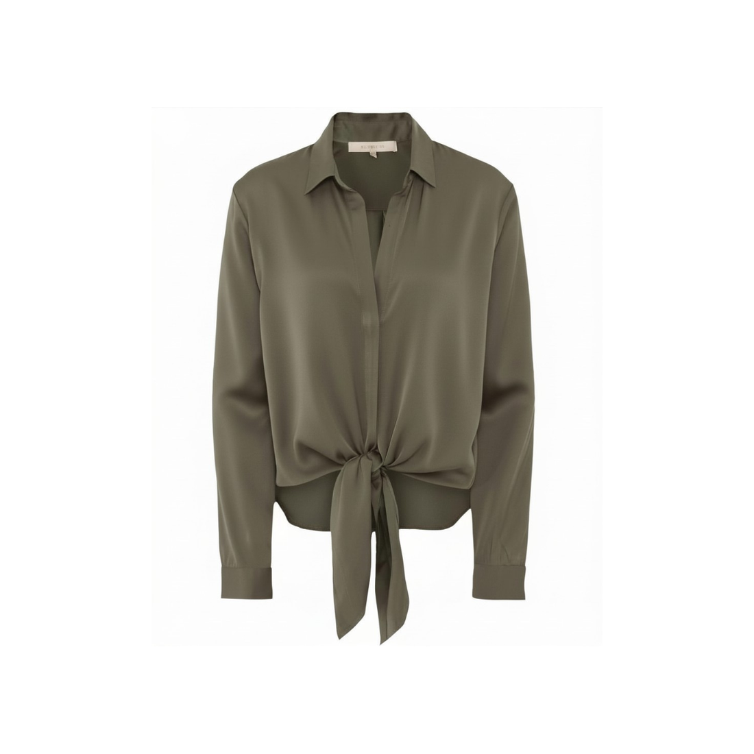 Luxurious silk top from Silk95Five in a soft khaki. Features a classic collar button-down front...
