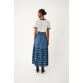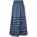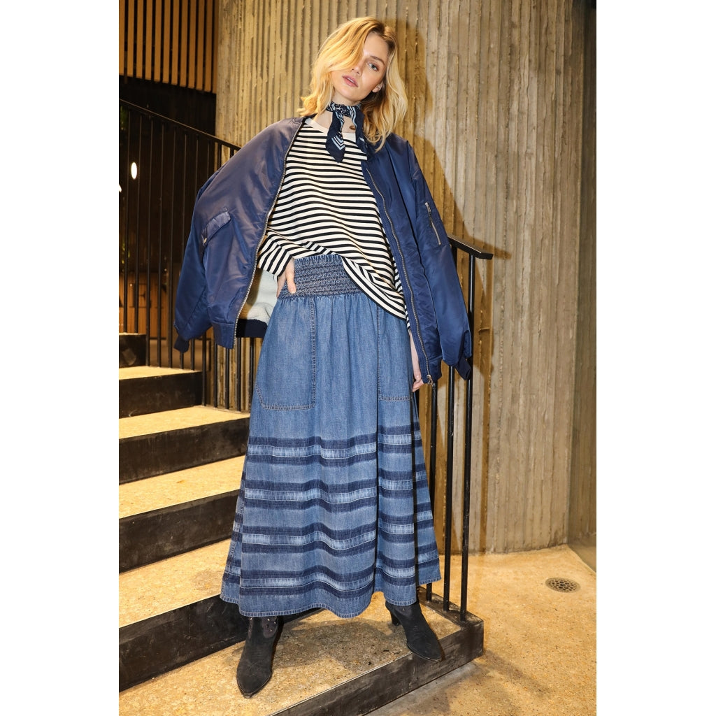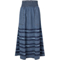 The Amond Denim Maxi Skirt blends casual comfort with effortless style. Crafted from soft denim-look fabric, its wide smocked waistband ensures a flexible yet secure fit, while the light A-line shape flatters every silhouette. Decorative tie-dye-inspired stripes and two front patch pockets add unique details that elevate its laid-back vibe. Ideal for relaxed days, this skirt offers both comfort and a trendy touch to your wardrobe.