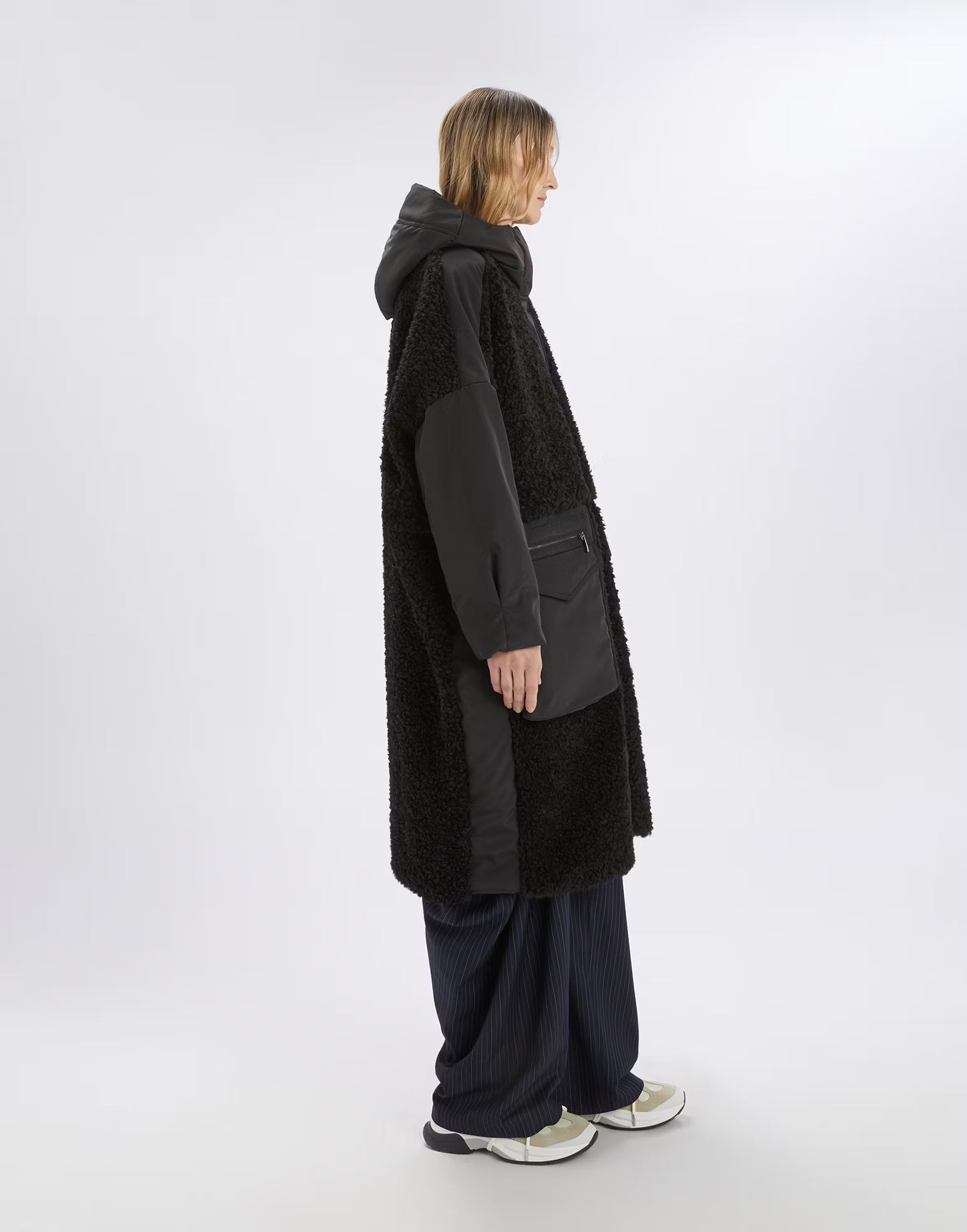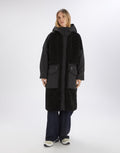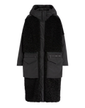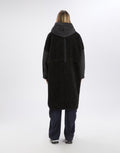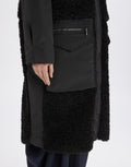 The Annotate Black Parka by designer High Couture combines the softness of double-face sherpa wool with the resilience of padded nylon, delivering medium-weight warmth and a sophisticated texture. Its boxy silhouette and wide kimono sleeves offer a modern urban look, complemented by an adjustable hood with drawstring for added versatility. Designed with a stand collar, front zip closure, slanted side pockets, and hem drawstring, this parka ensures both comfort and practicality in cooler conditions.