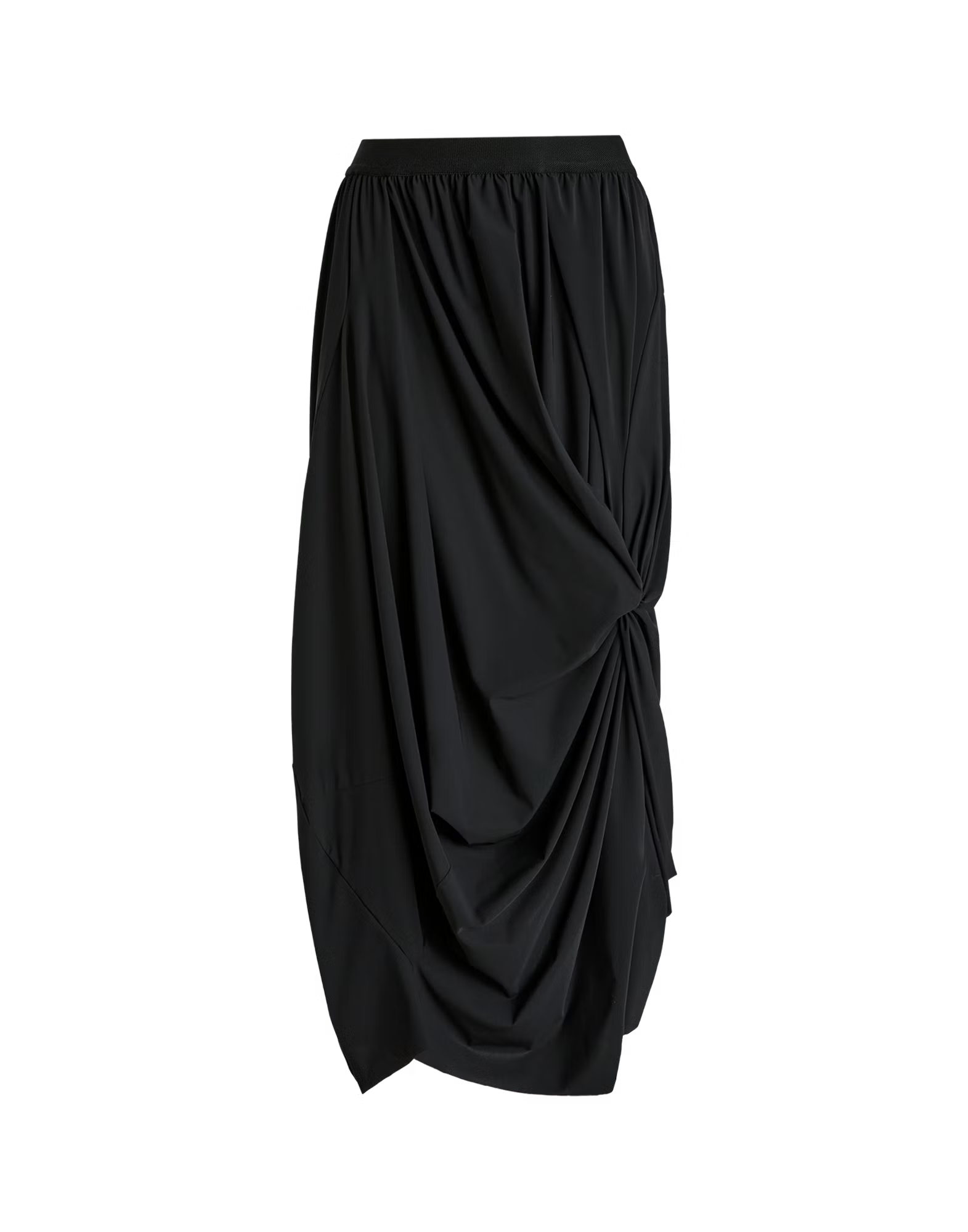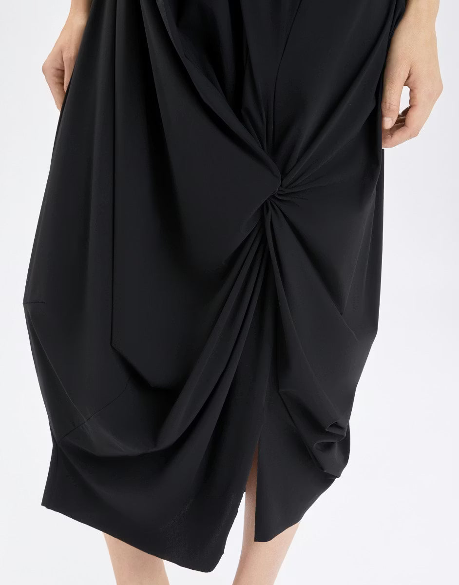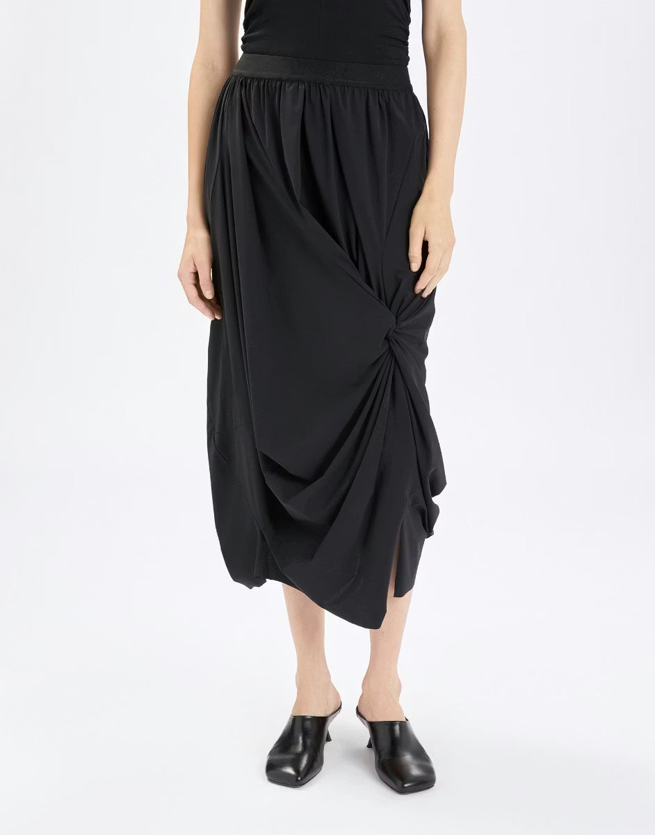 The Askance Rouched Skirt showcases designer sophistication through its innovative draping technique. Crafted from Sensitive jersey—a luxuriously versatile fabric—the skirt features an elegant front gather that culminates in a striking knot detail, instantly elevating your silhouette. The comfortable elastic waistband ensures all-day wearability, while the calf-length cut with asymmetric left slit delivers contemporary edge and movement. Made from 75% nylon and 25% elastane, this piece combines refined aesthetics with practical comfort, making it an essential addition to any discerning wardrobe.