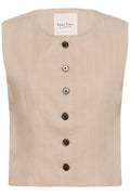 The Azania waistcoat by Part Two is a timeless layering piece in soft beige with subtle pinstripes. Featuring a classic round collar, oversized buttons running the full length, and a sleeveless cut, it effortlessly elevates any outfit. Perfect worn over shirts, dresses, or knitwear for an instantly polished look.