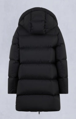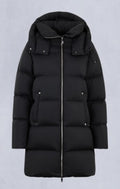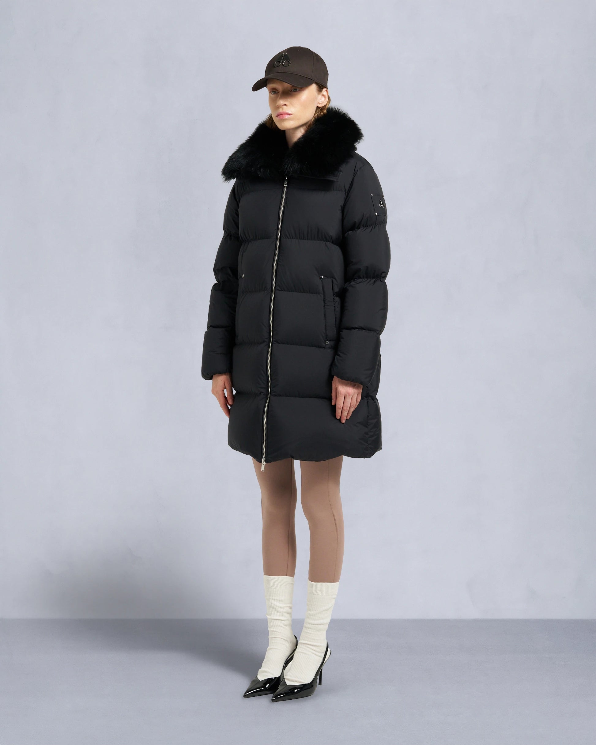 Stay warm and stylish with the Belle Dune Moose Knuckles Shearling Trim Puffer. This black long puffer, extending to mid-thigh, features a cozy shearling-lined detachable collar that adds both luxury and insulation. Equipped with a smooth zip closure and two front pockets, it offers practicality without sacrificing design. The iconic Moose Knuckles logo on the left shoulder adds a signature touch, making this coat a perfect blend of comfort and edge for cold days.