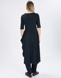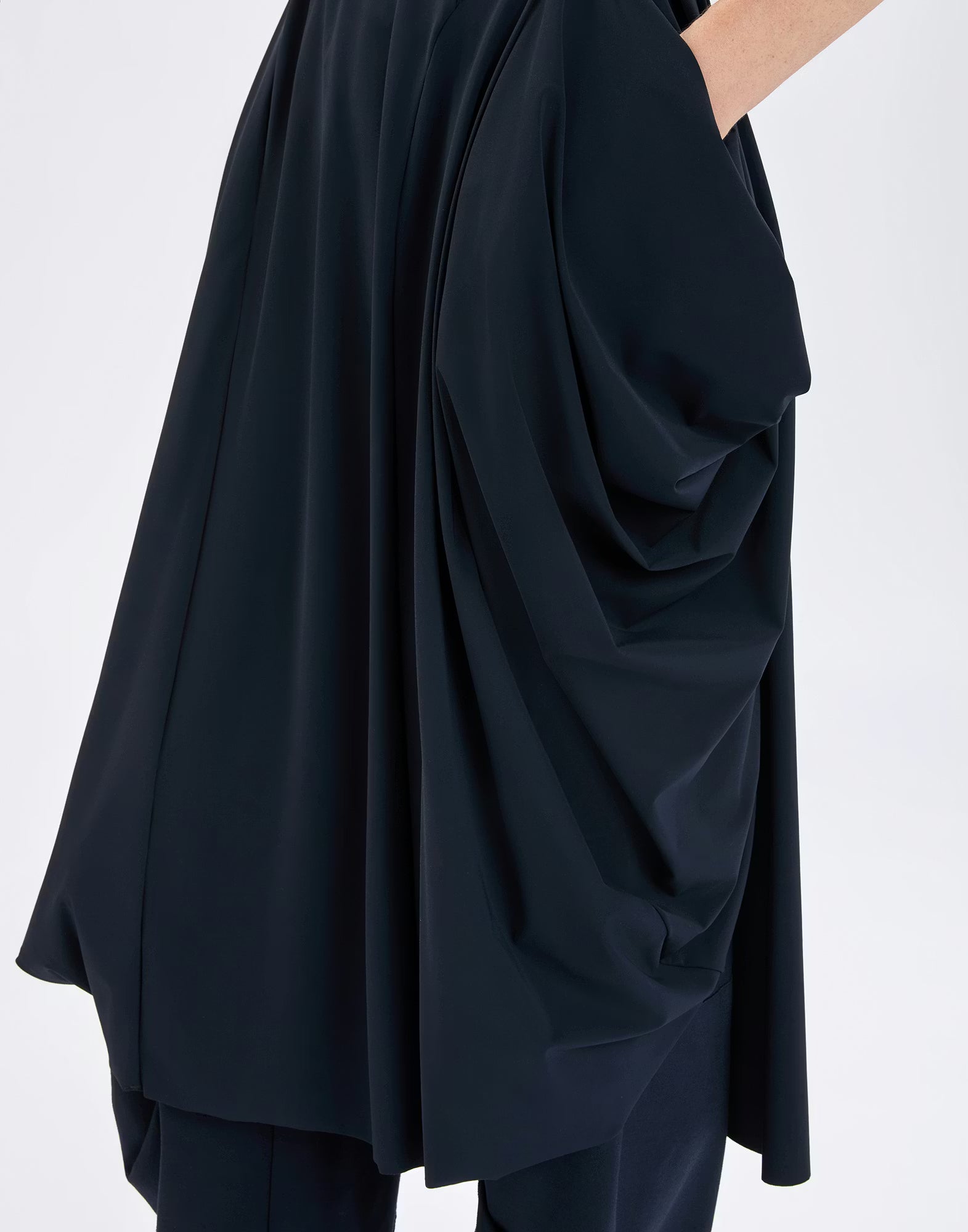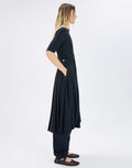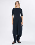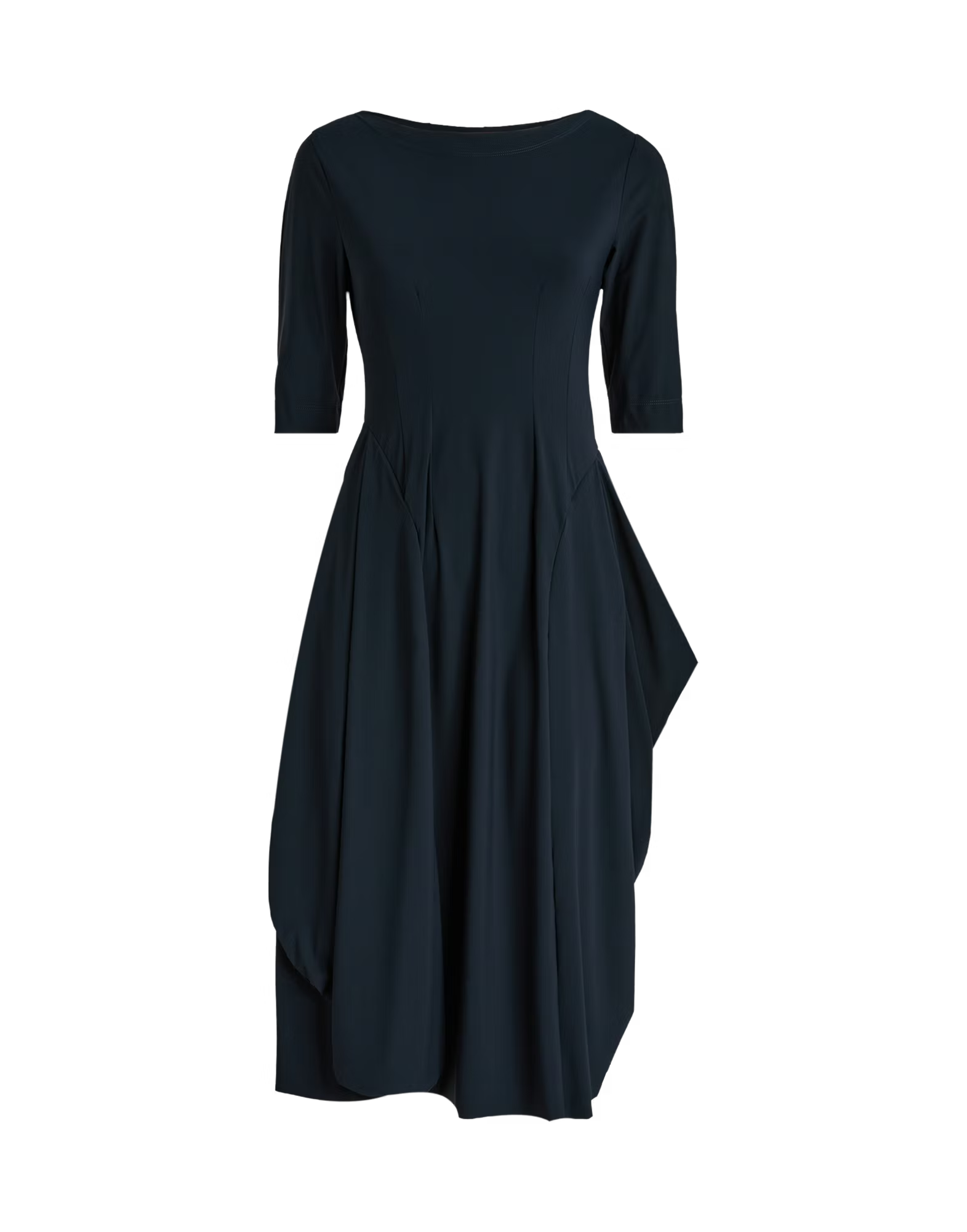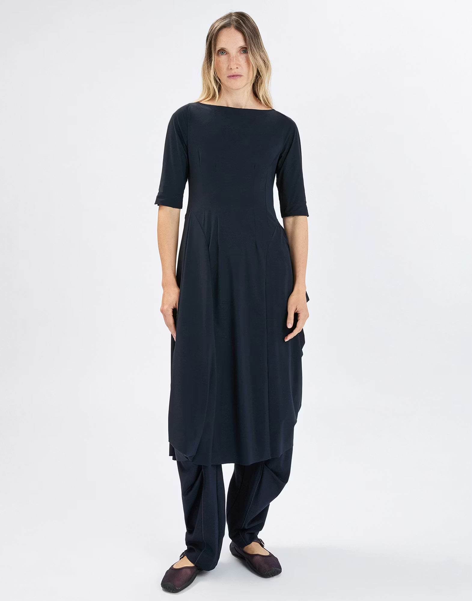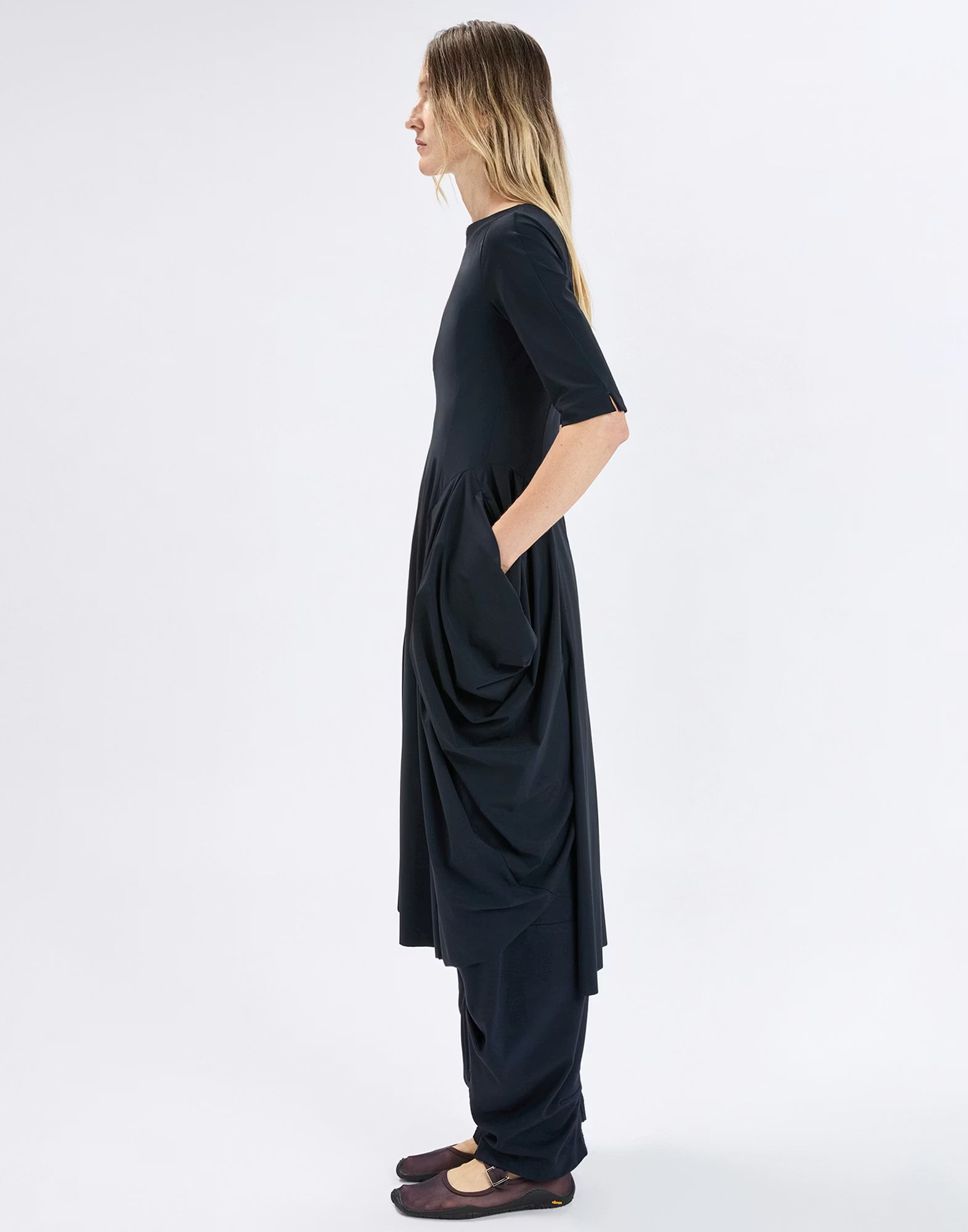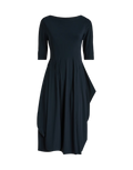 Navy New Messenger dress by HIGH featuring a classic straight neckline and three-quarter sleeves for effortless elegance. The fitted bodice transitions to a beautifully flowing skirt from the waist down, enhanced with extra fabric layering that creates stunning volume and dimension. Practical side pockets add functionality to this versatile piece.