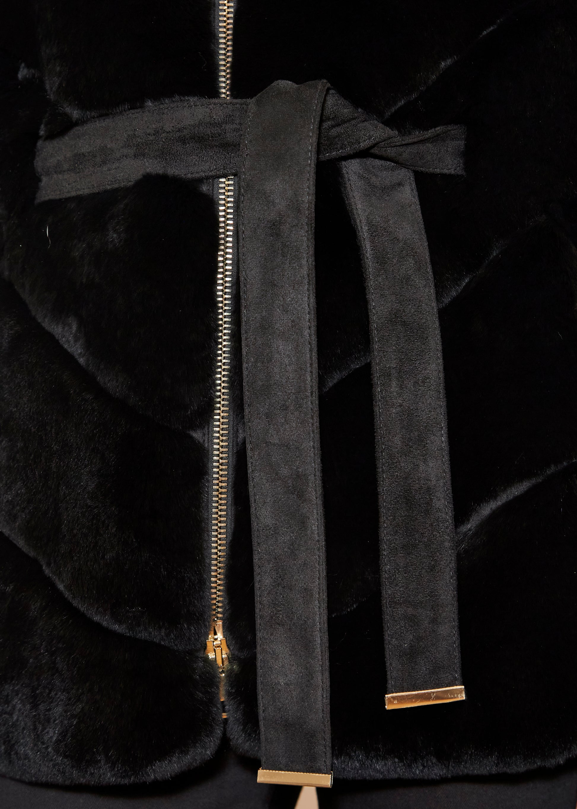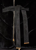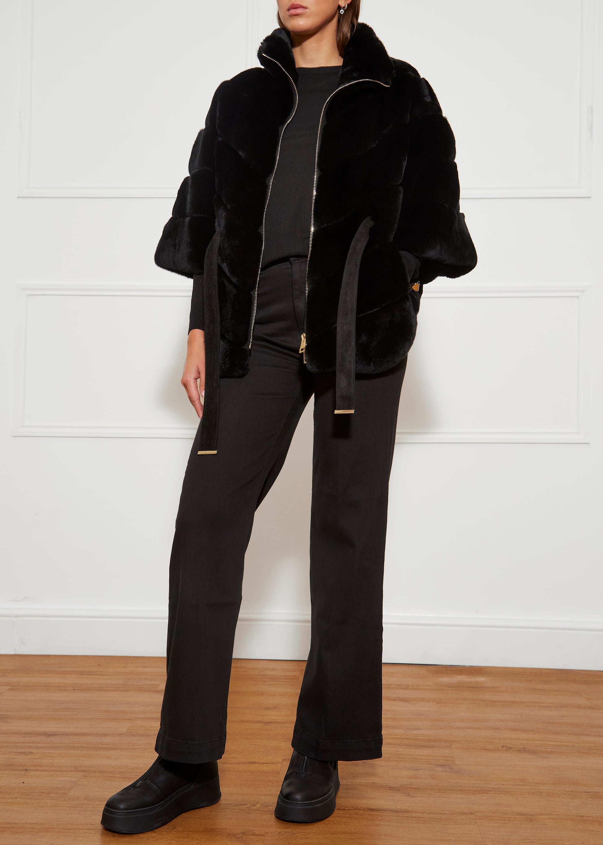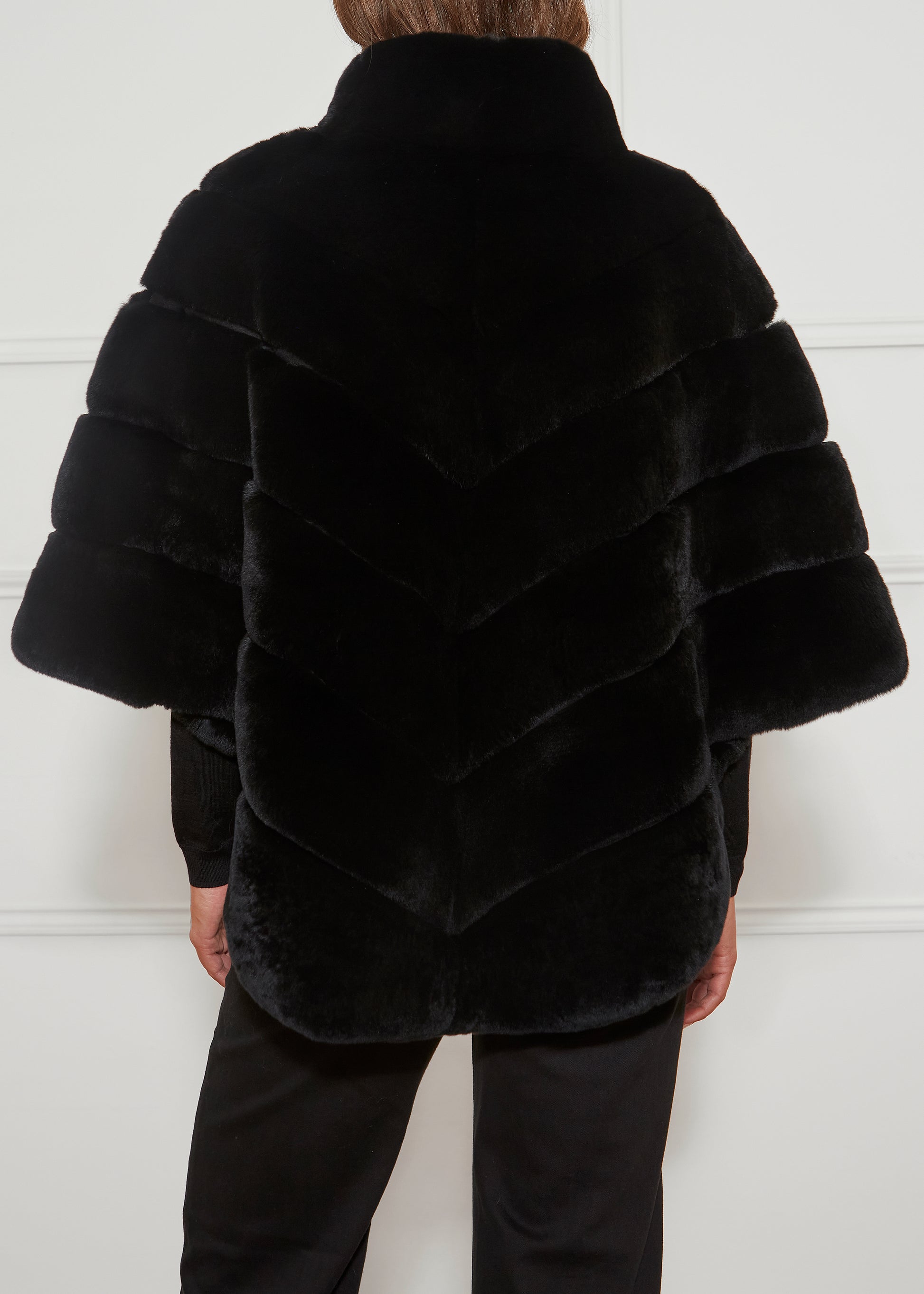 Keep your look chic and sophisticated with this luxurious rex rabbit cape coat. Crafted with an ultra-soft texture, the piece features high collar, central zip closure, and pockets on either side. The suede belt with gold metal detailing adds the perfect touch of glamour.