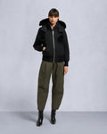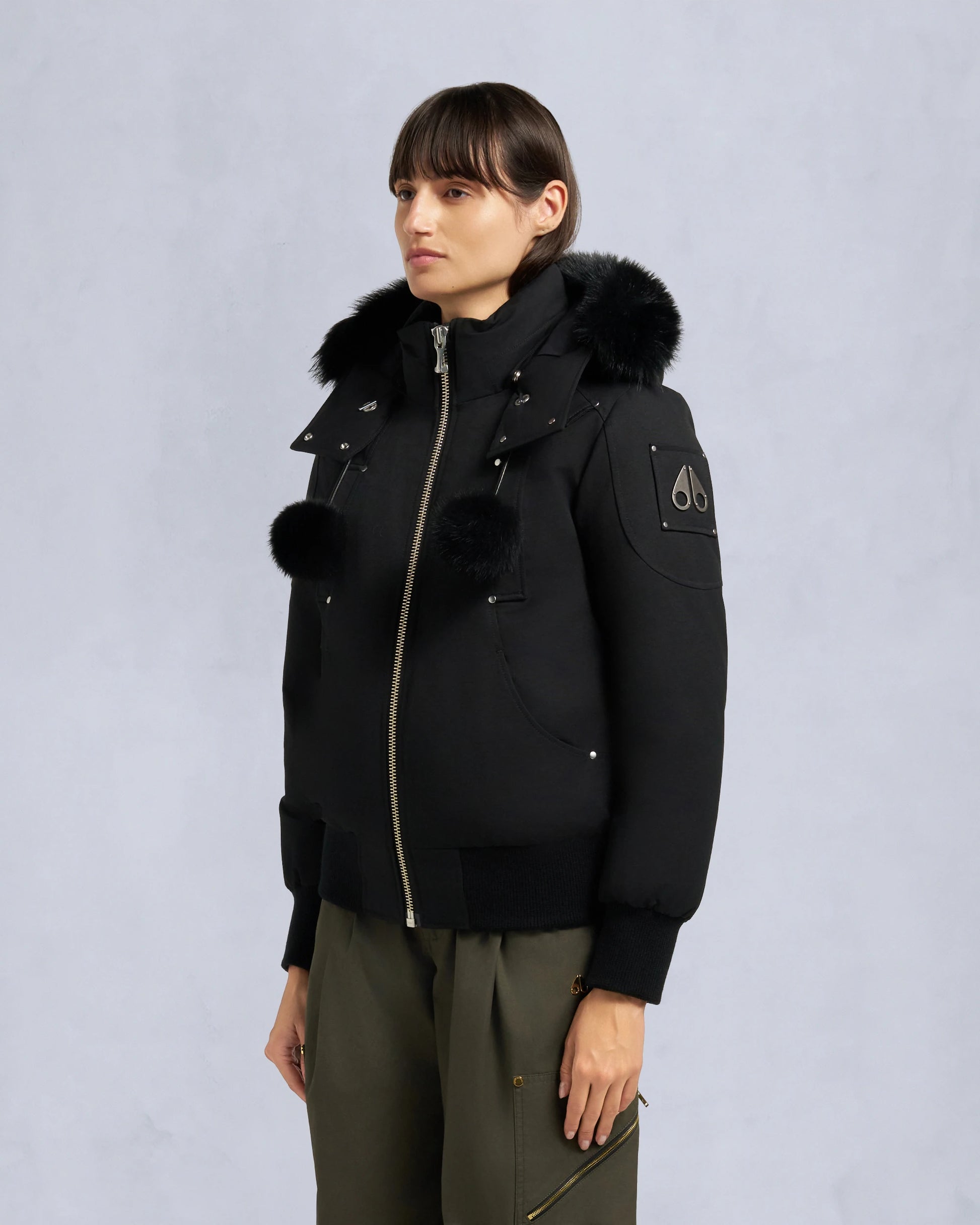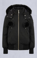 Elevate your outerwear with the Debbie Black Bomber Jacket by Moose Knuckles. Featuring the iconic logo on the left shoulder, this jacket combines style and warmth with two genuine fur pom poms framing the front collar. The adjustable hood, trimmed with luxurious fur all around, offers versatility for changing weather. Practical sheep skin pockets provide cozy hand warmth and a touch of sophistication. Perfect for staying comfortable while making a bold statement in colder seasons.