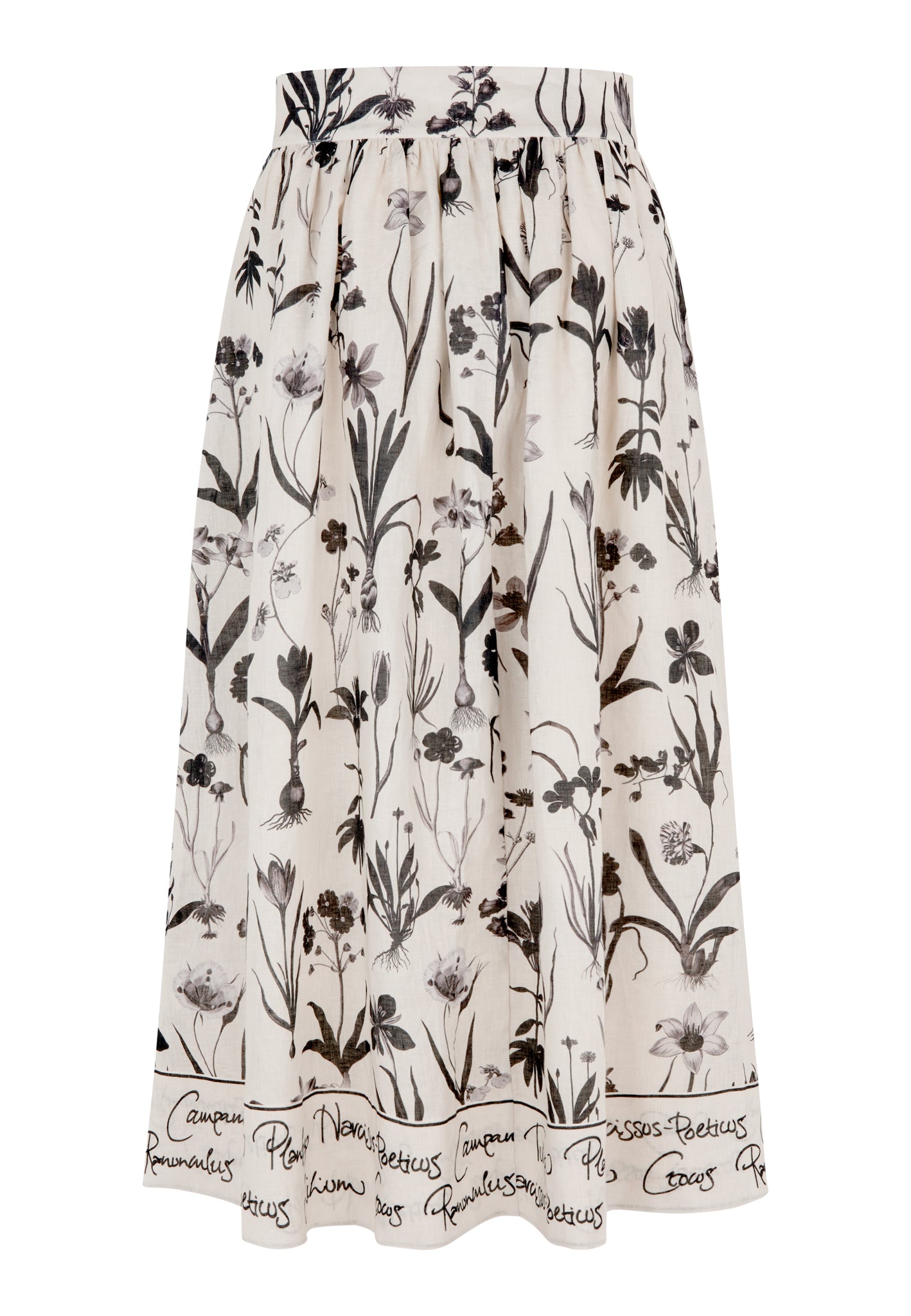 Embrace effortless summer style with the Edda Botanical Skirt. Crafted from 100% linen, this relaxed yet refined piece features a striking botanical print with handwritten script detailing. The high, wide waistband creates a flattering silhouette, while the full flared cut flows gracefully to mid-calf. Practical side pockets and complete lining ensure comfort and ease. Perfect for warm days when you want to look polished without sacrificing comfort.