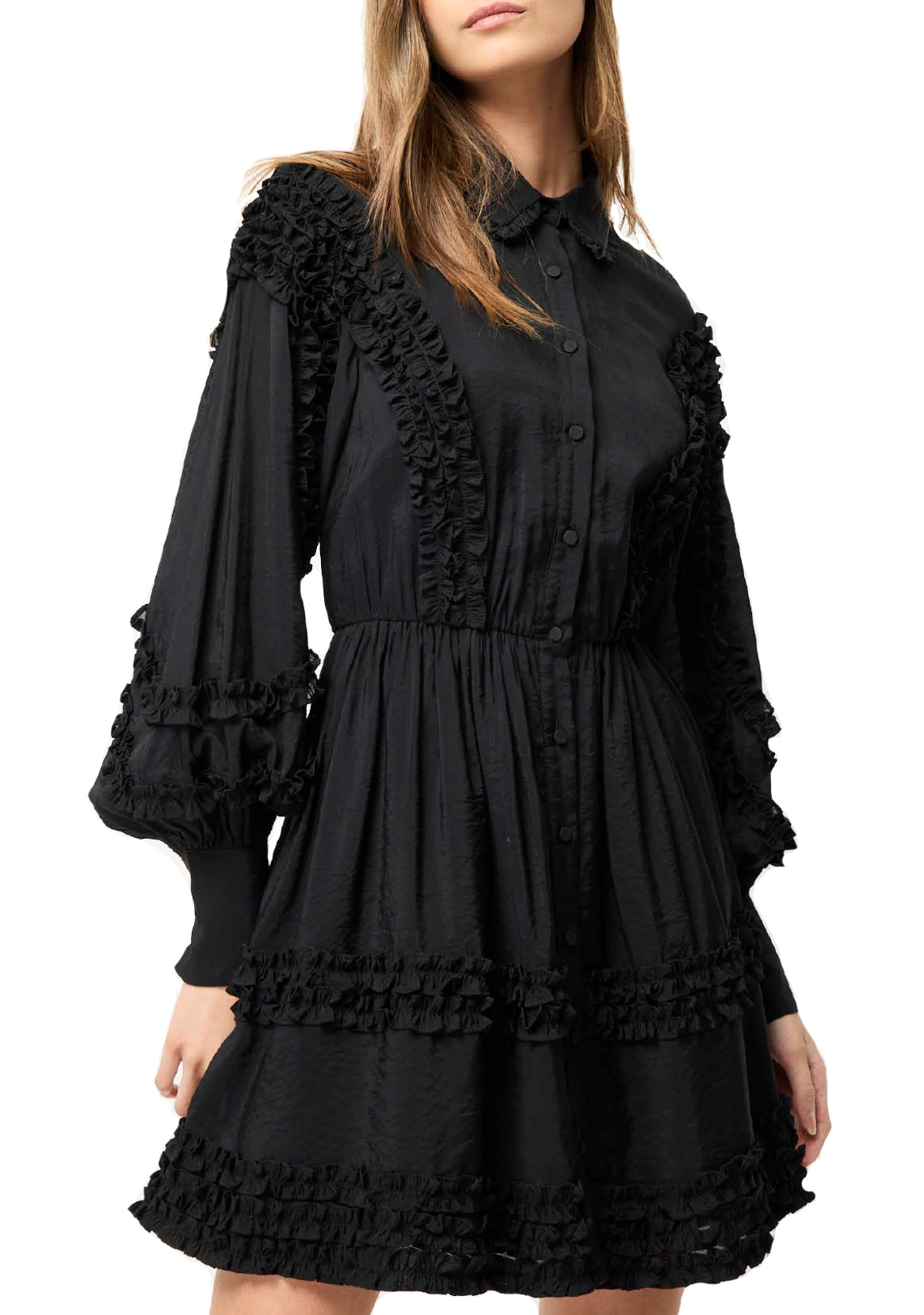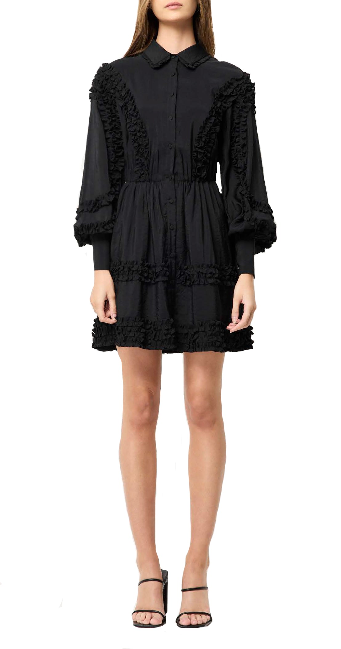 Elliatt Jayda Black Mini Dress. The little sister dress of Madison. The shorter version is still elegant, fun but yet delicate and feminine. Offers an A-line cut. Just like Madison, Jayda is brimming with delicate detail of ruffled frills throughout. Features a button-down front, a frilled collar, an elastic waistband to cinch and enhance your waist, long puffed sleeves and cuffed with an invisible zip. Match this mini dress with heels or trainers. The perfect number for the spring/summer events ahead. Jayda is also available in white.