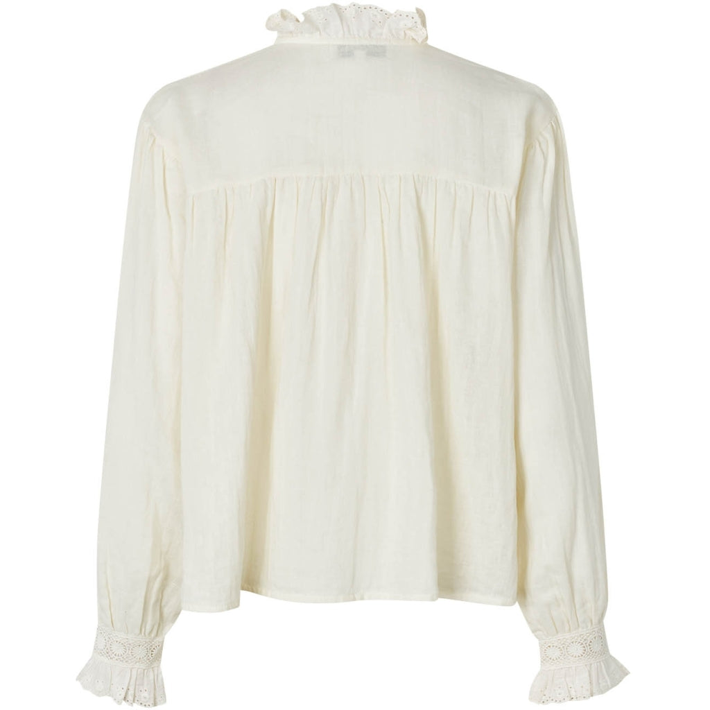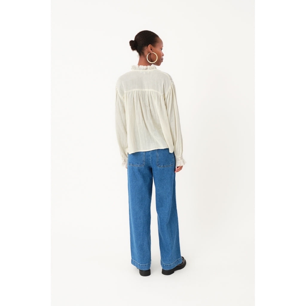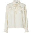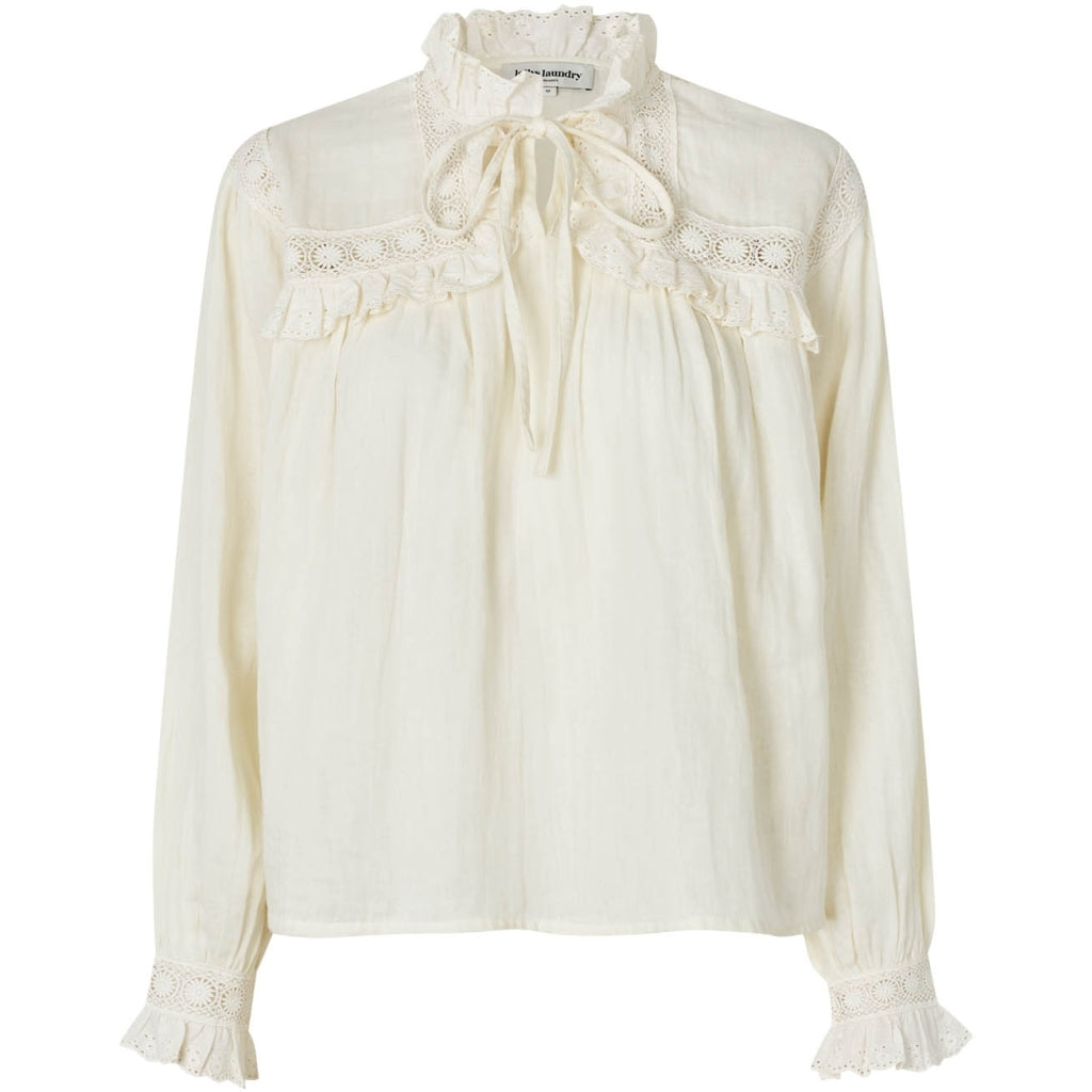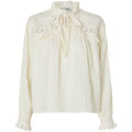 The Gemma Creme Shirt brings timeless romance to your wardrobe with its elegant vintage details. Crafted from soft, breathable 100% viscose, it offers all-day comfort. The decorative yoke is enhanced with broderie anglaise and delicate lace trim, while the long sleeves feature fine pleats and finished cuffs adorned with lace and ruffles. A softly gathered high neckline ties with a bow for versatile styling. Perfect in cream, this shirt adds a graceful, feminine touch to any outfit.