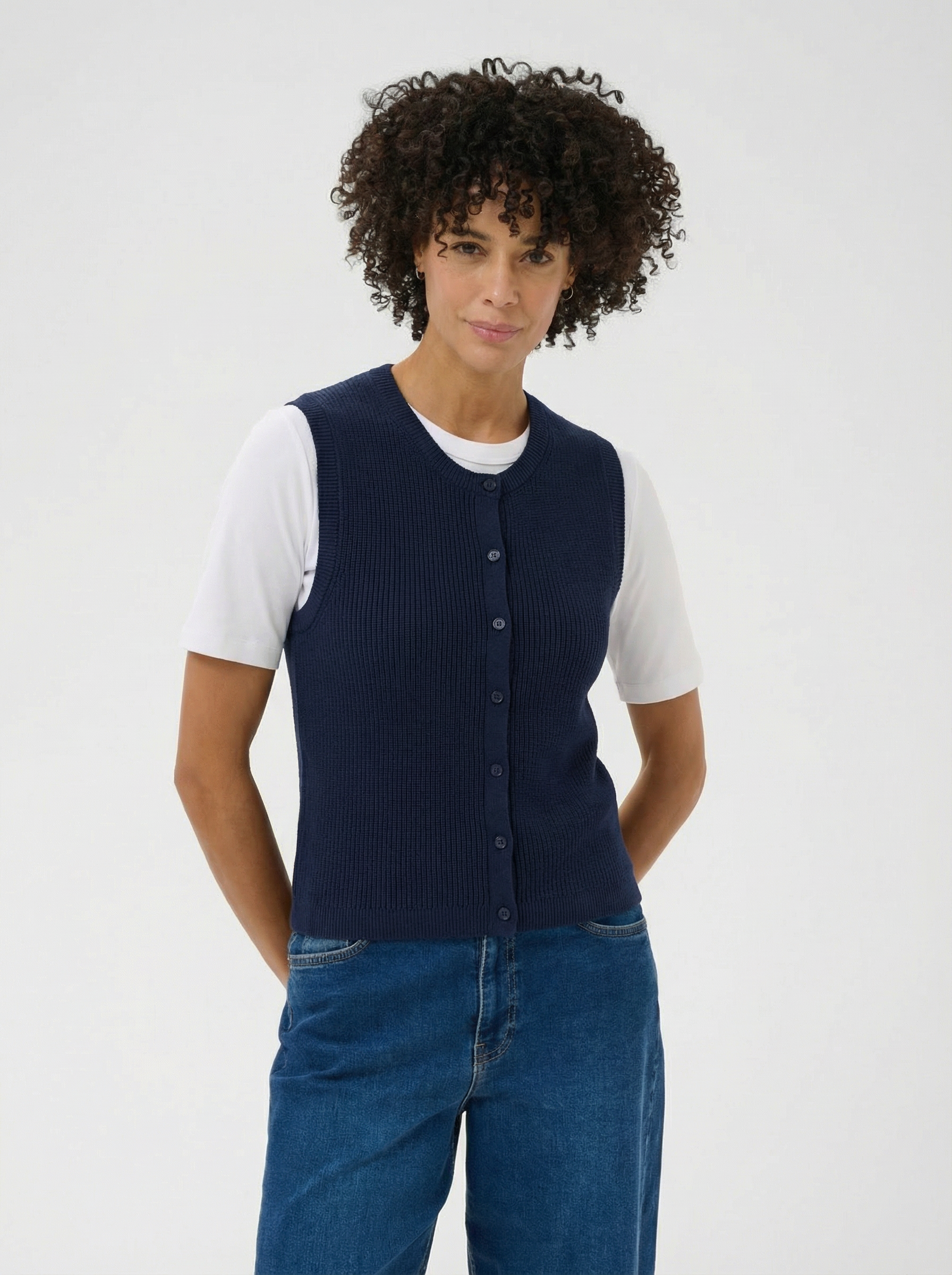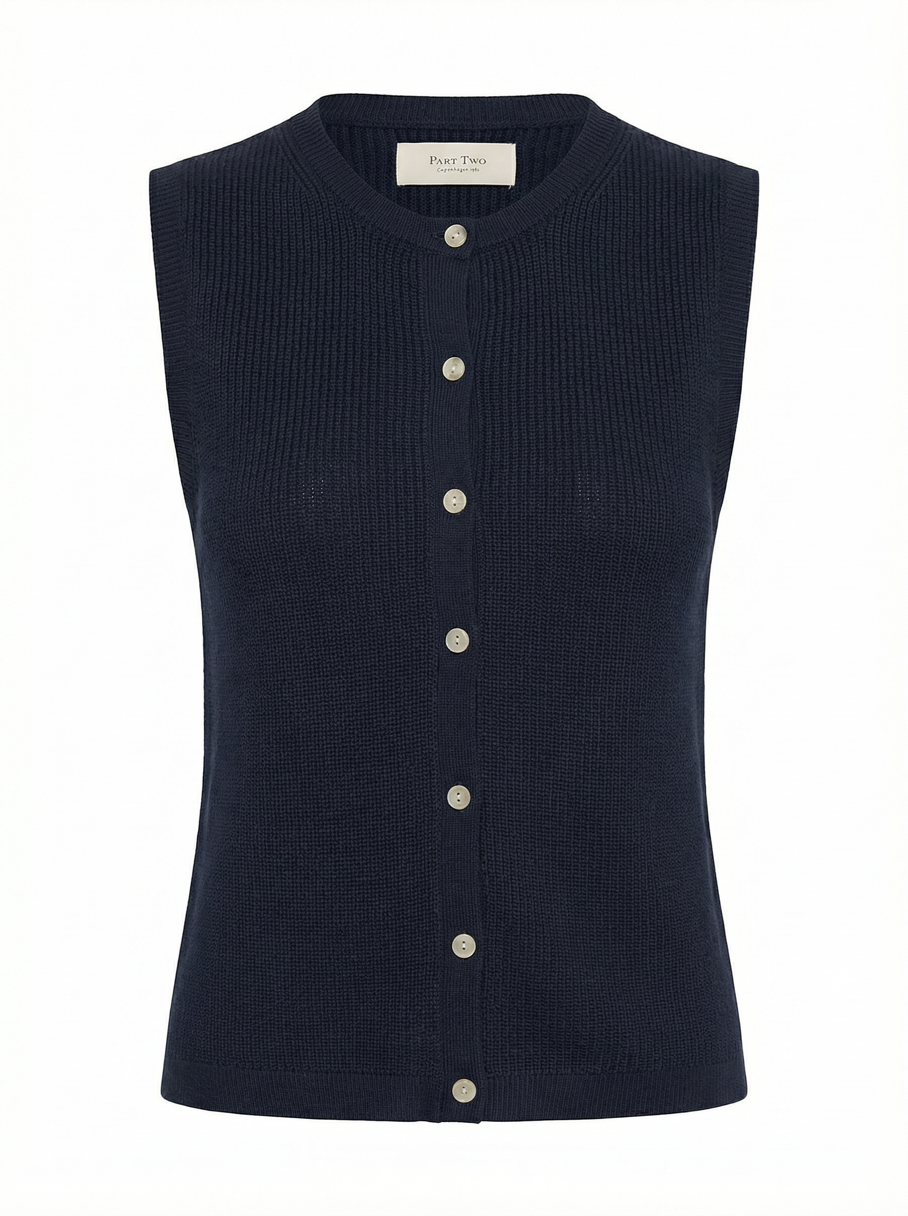 Gemma Navy Cotton Knit Gilet by Part Two A timeless layering essential, this sleeveless knit gilet features a classic round collar and button-front closure. Crafted from soft cotton in crisp whisper white, it offers versatile styling for any season. The mid-length cut provides comfortable coverage, making it perfect for layering over shirts or wearing standalone. An effortless wardrobe staple from designer Part Two.