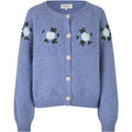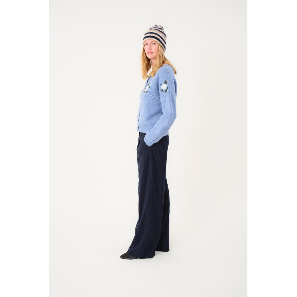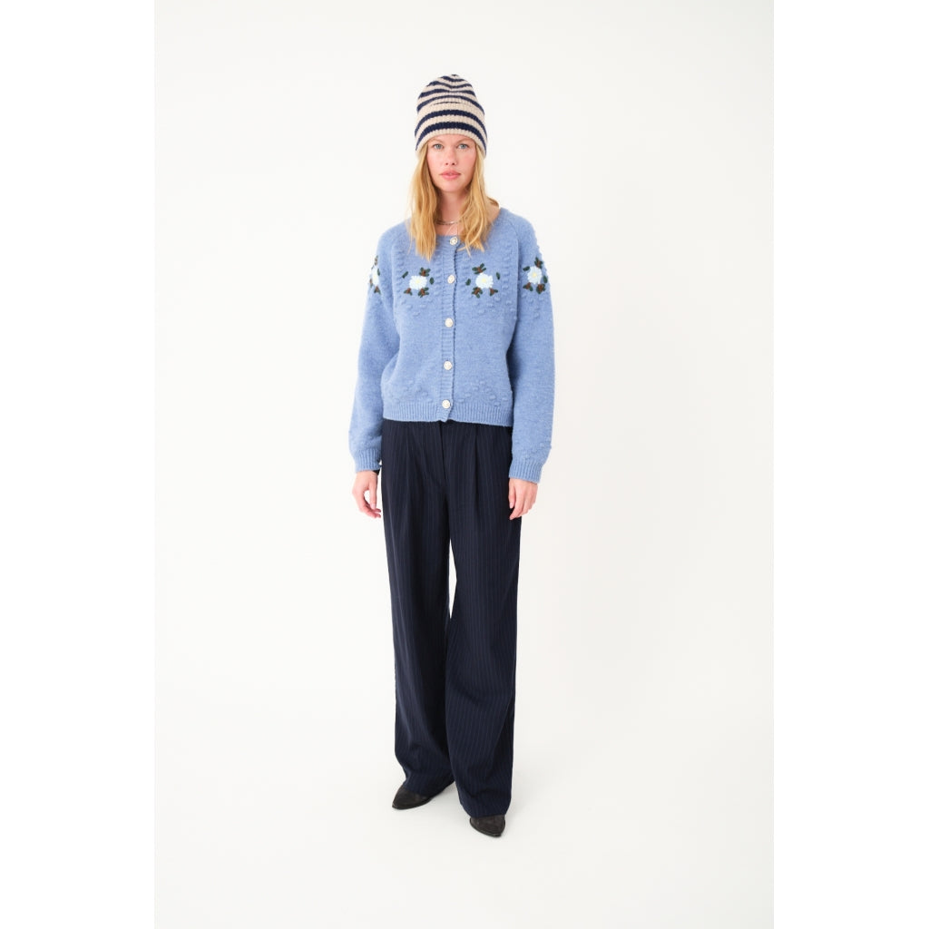 The Gracelynn Blue Melange Knit Cardigan blends cozy comfort with elegant charm. Featuring delicate floral embroidery on the front and shoulders, it's accented by pearl buttons that enhance its timeless appeal. Subtle bobble knit details and ribbed cuffs and hem add texture and a handcrafted touch. The round neckline with fine rib trim frames your style perfectly, making this cardigan a romantic, versatile addition to your wardrobe.