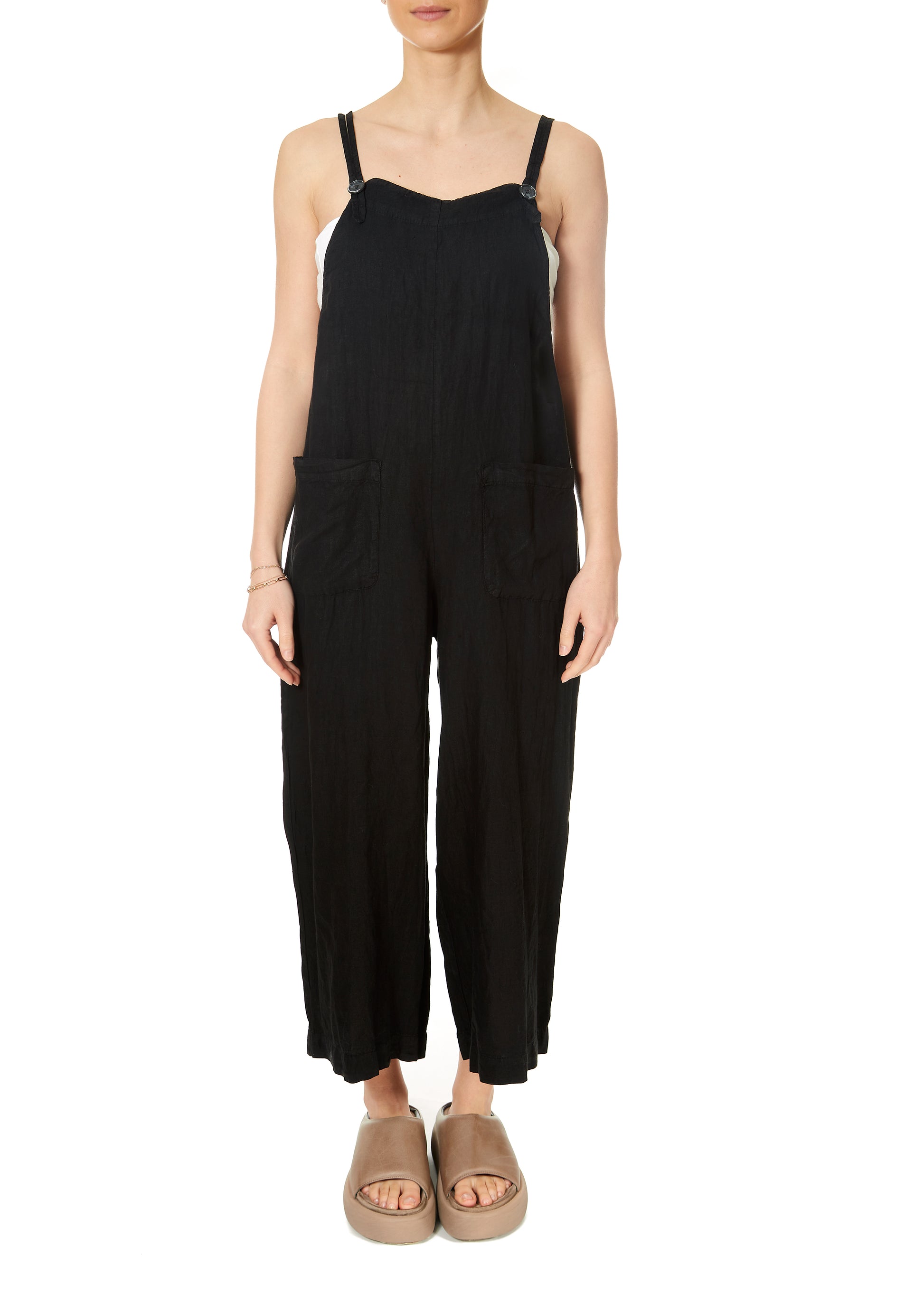 Isabel Black Linen Dungarees by Velvet. The dungarees feature a pocket on either side, button close around the bust line, an oval ruched neckline. An essential for the wardrobe this summer, with a light weight feel and lovely linen fabric.