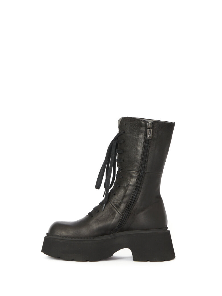 Elevate your everyday style with Lofina's black, leather, chunky lace-up and zip boots. Crafted from premium leather, these calf-height boots combine practical fastening with timeless style, dual lacing and side zip closure give you flexibility in how you wear them. The chunky sole provides confident stride and all day comfort, while the sleek black leather works seamlessly with any wardrobe. A versatile investment piece that transitions effortlessly from day to night.