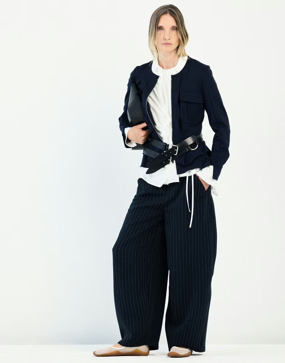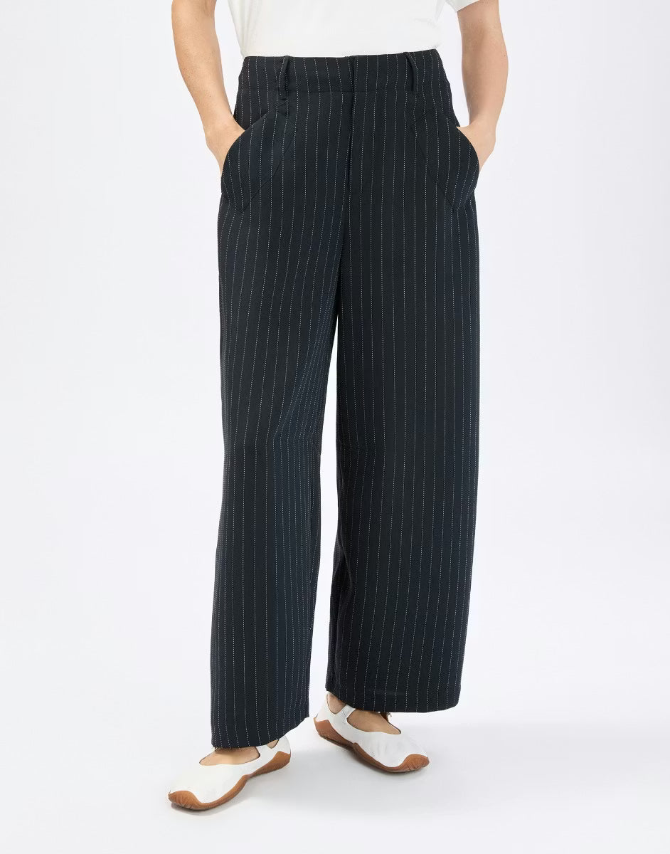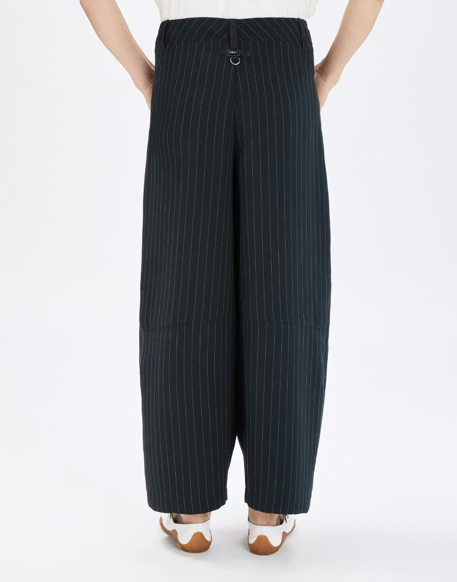 Elevate your everyday wardrobe with the Limbo Pinstripe Lantern Trousers—where contemporary design meets timeless tailoring. These statement pants reimagine classic menswear with a modern silhouette, featuring a generously cut, cropped leg that delivers both comfort and sophistication. The refined pinstripe pattern, subtly echoing traditional tailor's markings, adds understated elegance to any outfit. Crafted from stretch pinstripe fabric that's lightweight and beautifully soft, these trousers move with you throughout your day. Practical details include a structured waistband with belt loops, concealed hook-and-zip closure, and slanted side pockets. Perfect for those who refuse to compromise between style and wearability.