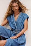 Effortless elegance meets casual charm with this Love denim dress by Part Two. Cut in a flattering middy silhouette, it features a classic V-neckline and short sleeves for versatile styling. Two distinctive buckle details cinch the waist, creating definition and visual interest. A knee-high slit adds movement and modern flair to the skirt. Perfect for weekend outings or dressed-up casual occasions, this piece combines timeless denim appeal with contemporary design touches.
