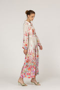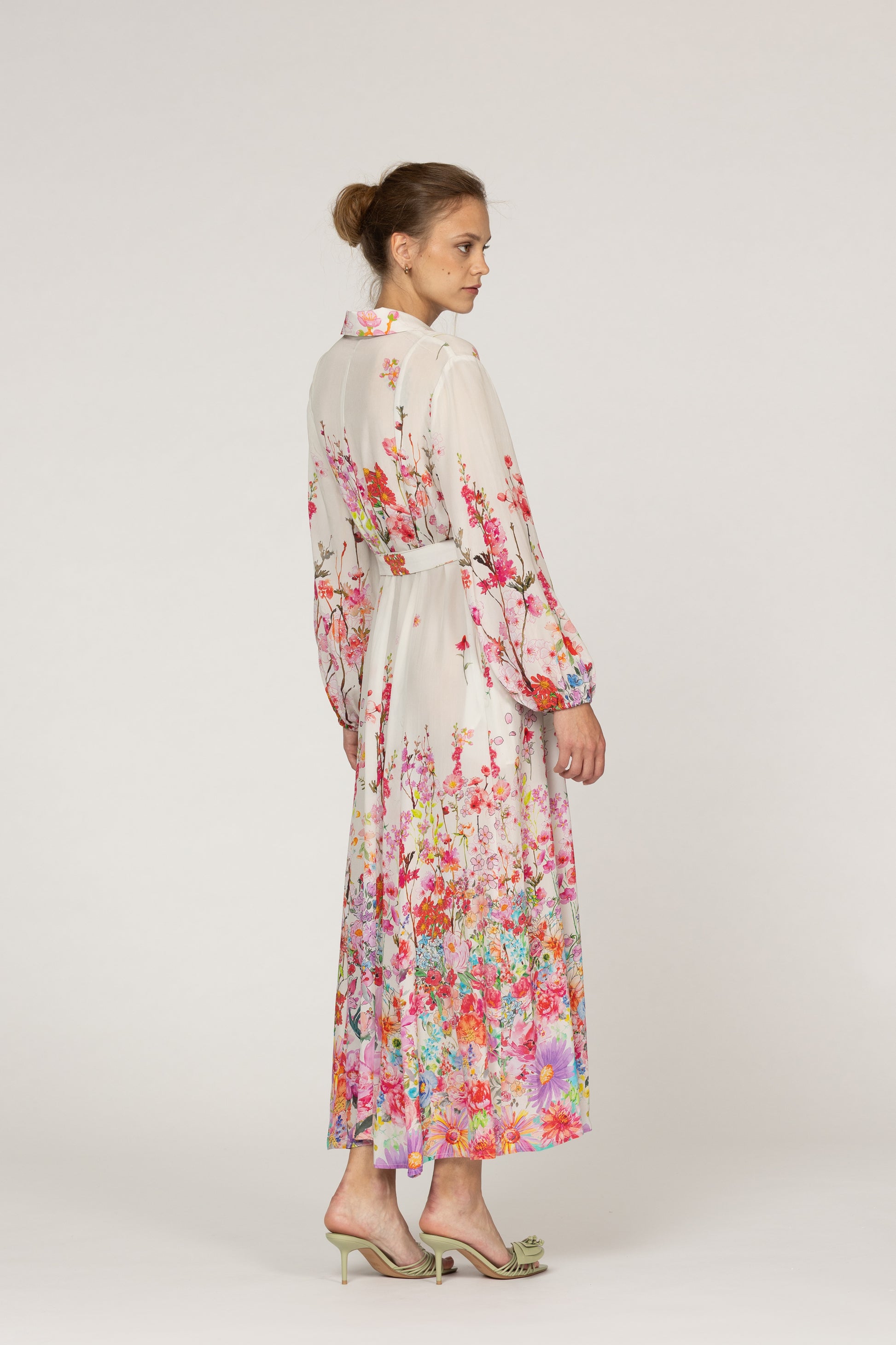 Elevate your summer wardrobe with this stunning Inoa Mahonia silk shirt dress, featuring a charming floral print in vibrant pink, blue, yellow, and purple hues. The relaxed silhouette is anchored by a flattering tie waist that defines your shape, while cuffed long sleeves offer effortless sophistication. Perfect for garden parties, leisurely brunches, or breezy days out, this versatile piece transitions seamlessly from day to evening wear.