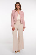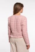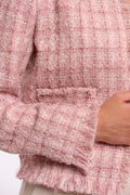 Discover understated sophistication with the Marissa Blush Pink Jacket by Rino & Pelle. This short tweed-style jacket features a luxurious bouclé-inspired texture that brings timeless appeal to your wardrobe. Thoughtfully designed with delicate hook-and-eye closures, subtle pocket details, and artisanal frayed edges along the sleeves, hem, and front, it seamlessly transitions from tailored ensembles to relaxed everyday wear. A versatile investment piece that exudes refined elegance.