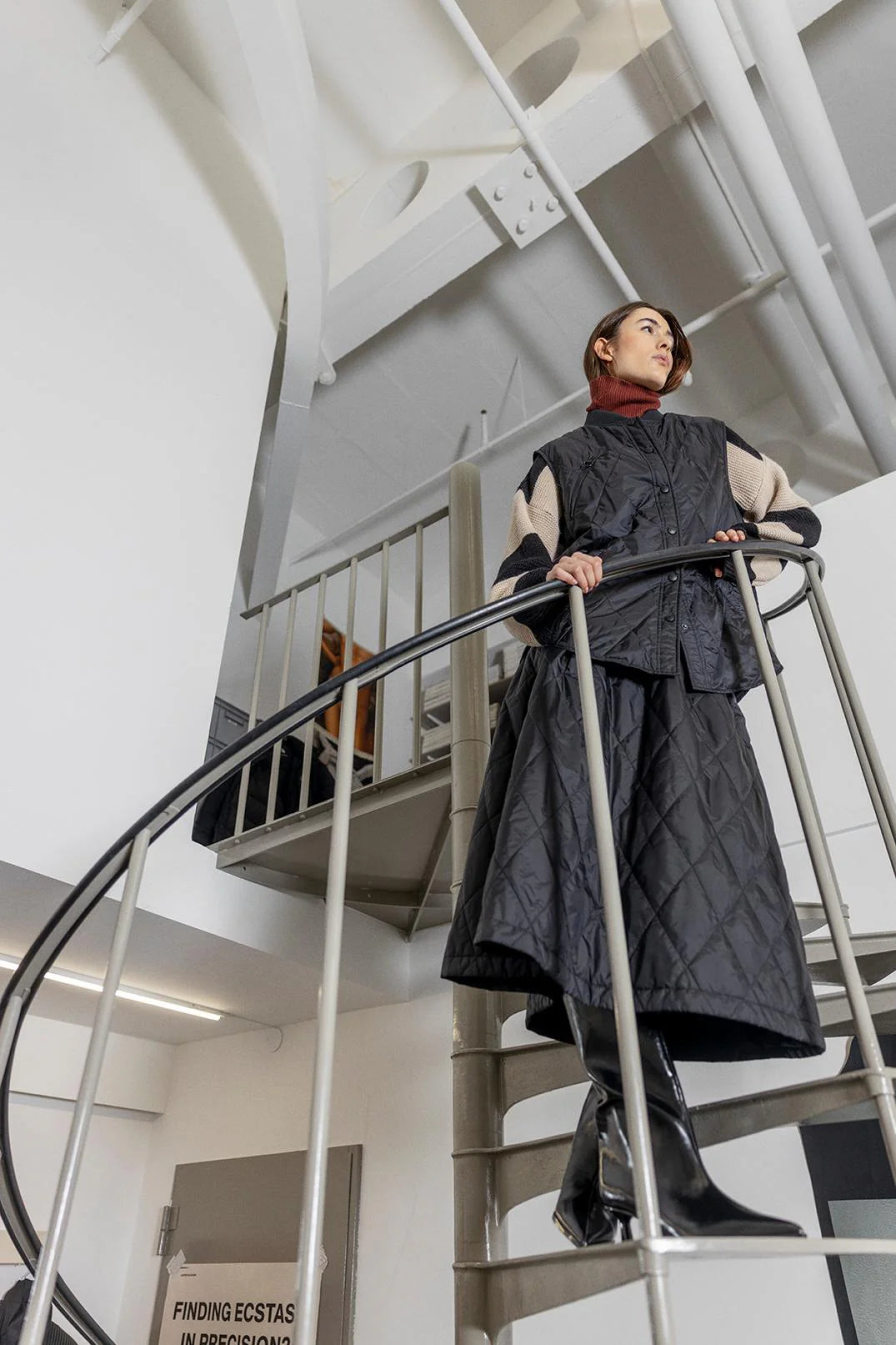 The Nicoline Black Quilted Midi Skirt blends style and practicality with its voluminous A-line silhouette and soft padded structure. Crafted from lightweight, high-performance nylon, it offers breathable comfort thanks to eco-friendly Sorona® filling. An elastic waistband ensures a perfect fit, while side seam pockets add everyday convenience. Elevate your wardrobe with a skirt that moves with you and embraces sustainable innovation.