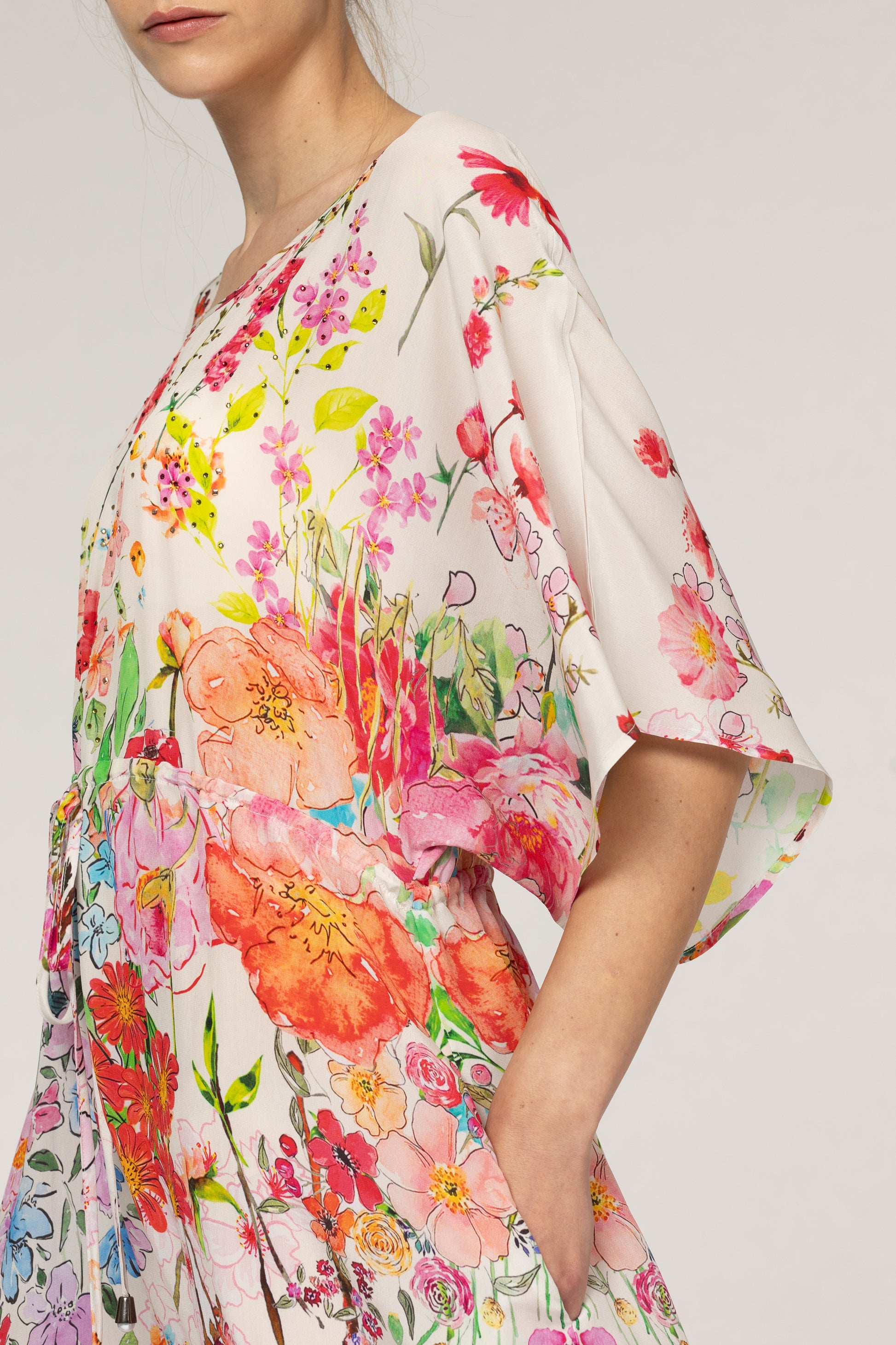 Embrace effortless elegance with this stunning Inoa Peony silk maxi dress. Featuring a relaxed, flowing silhouette with three-quarter sleeves, it drapes beautifully for all-day comfort. The white fabric comes alive with a vibrant botanical, floral print in jewel-tone pinks, purples, yellows, and reds create a captivating garden scene. Perfect for warm-weather occasions, garden parties, or whenever you want to feel gracefully put-together without sacrificing ease.