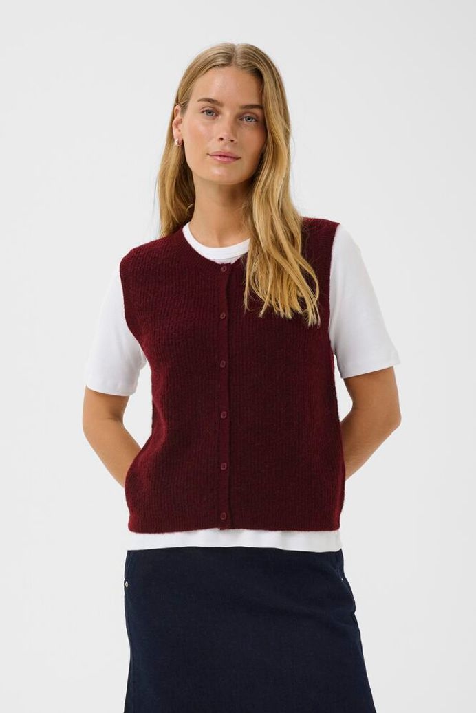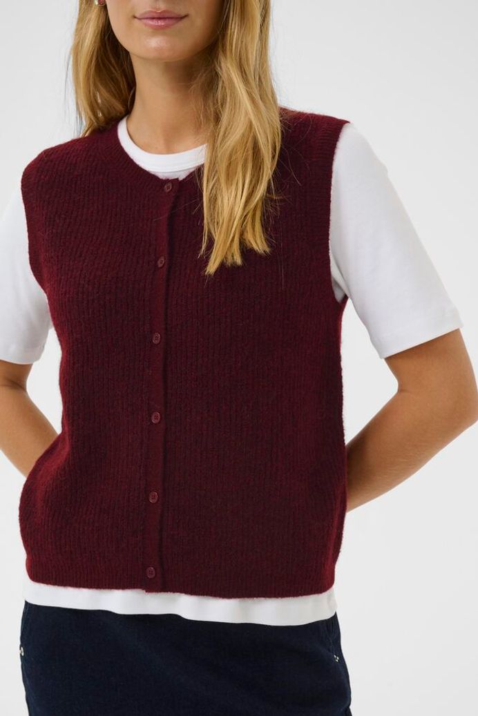Introducing the Pimira, a sophisticated knitted vest in rich tawny port burgundy that effortlessly elevates any wardrobe. Crafted with a sumptuous, fluffy texture, this timeless piece features a classic round neckline and convenient front button closure. Layer it over your favourite tee or shirt for instant polish—whether you're heading to the office or enjoying a relaxed weekend. The soft, tactile knit drapes beautifully and transitions seamlessly from professional to casual, making it the versatile essential you'll reach for again and again. Model wears size M at 174 cm.