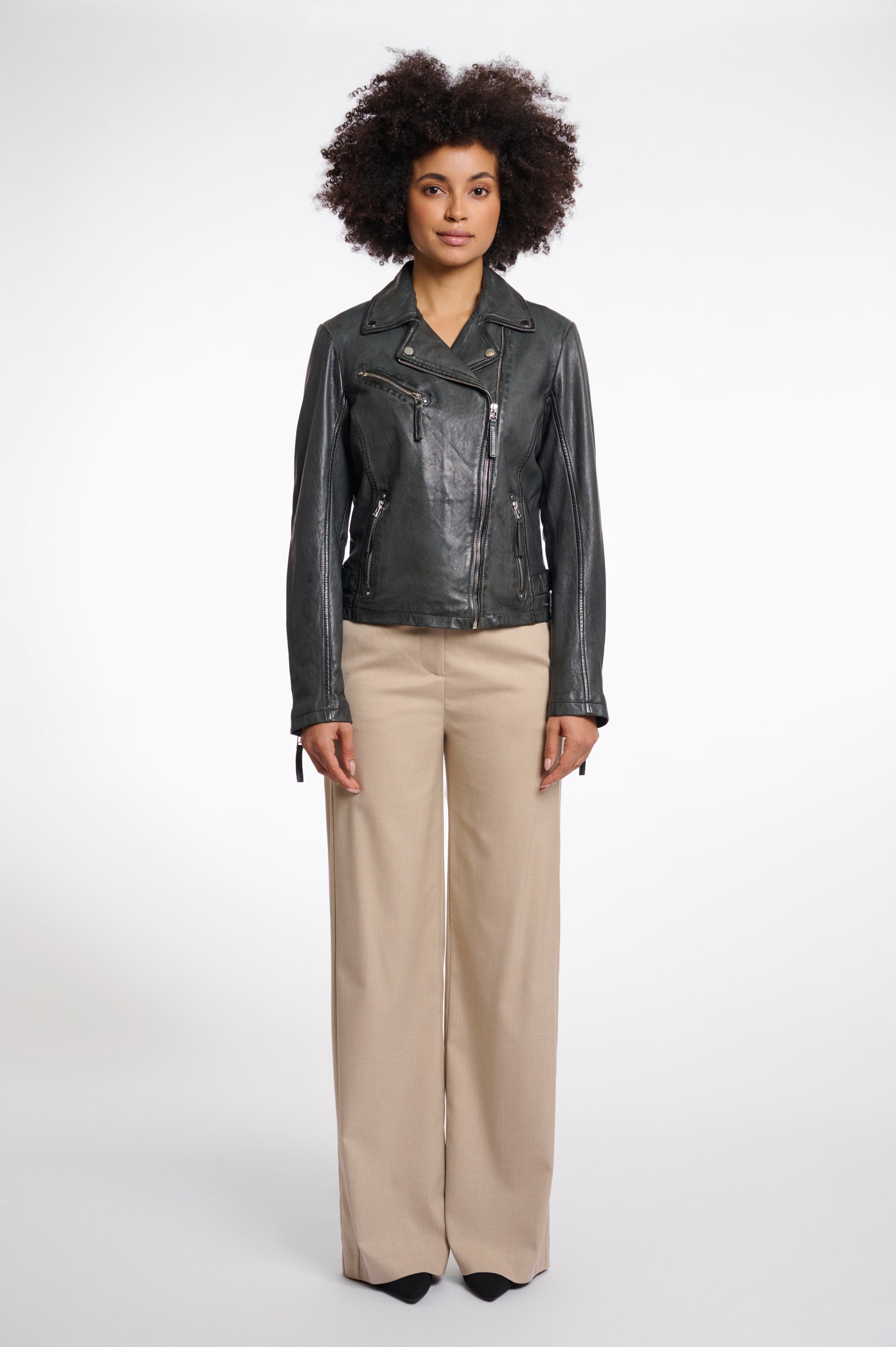 Embrace sleek sophistication with the Renee Leather Biker Jacket in Deep Iron Grey by Rino & Pelle. Crafted from pure leather, this jacket features foldback lapels with sleek silver studs, buckle details, zips to the cuffs and three zipped pockets for edgy detail. Perfect for making a statement, this timeless biker jacket combines style and durability effortlessly.