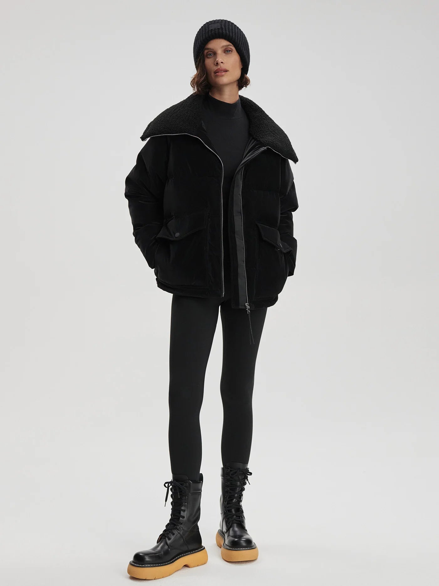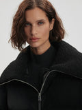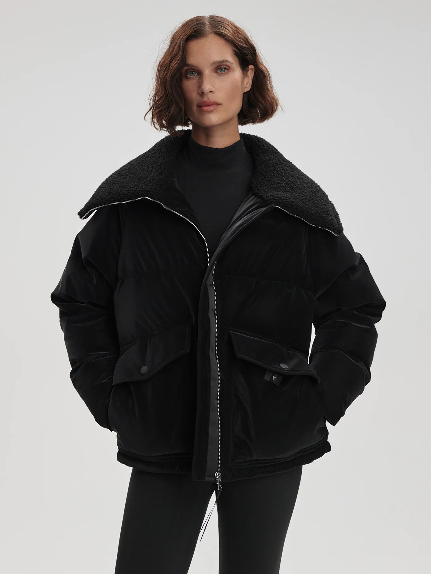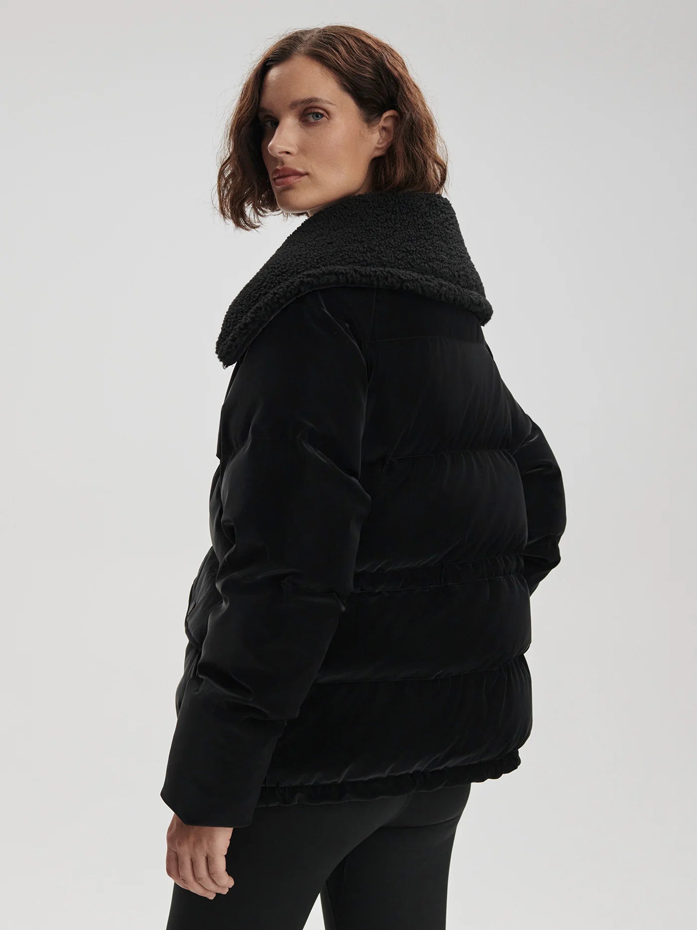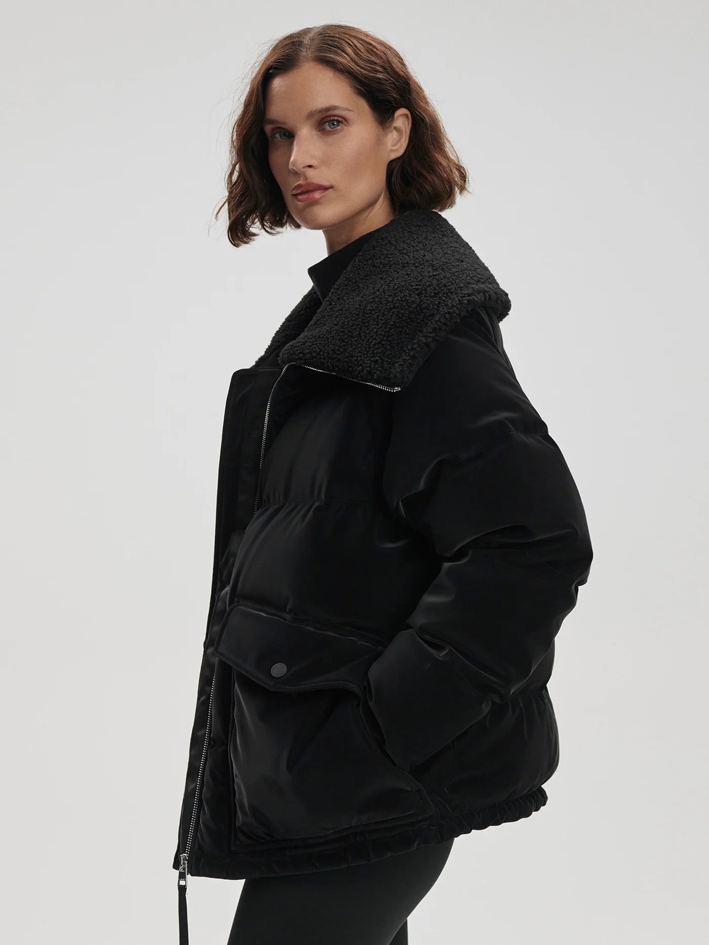 The Roseville jacket combines sophisticated style with serious warmth. Crafted from sumptuous Nubuck PU and filled with insulating down, this oversized puffer delivers exceptional comfort through cooler seasons. The boxy silhouette and cosy sherpa collar create an effortlessly contemporary look, while practical internal cuffs and patch pockets keep essentials within reach. An elegant layering piece that transitions seamlessly from autumn through winter. Cut for a relaxed, oversized fit—order your true size for the perfect drape.