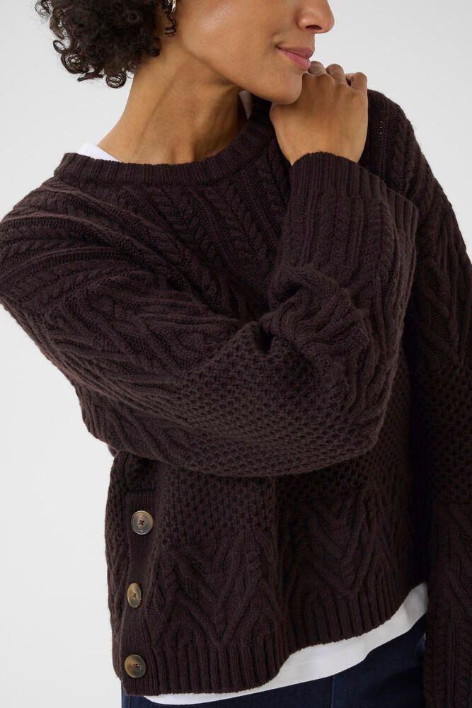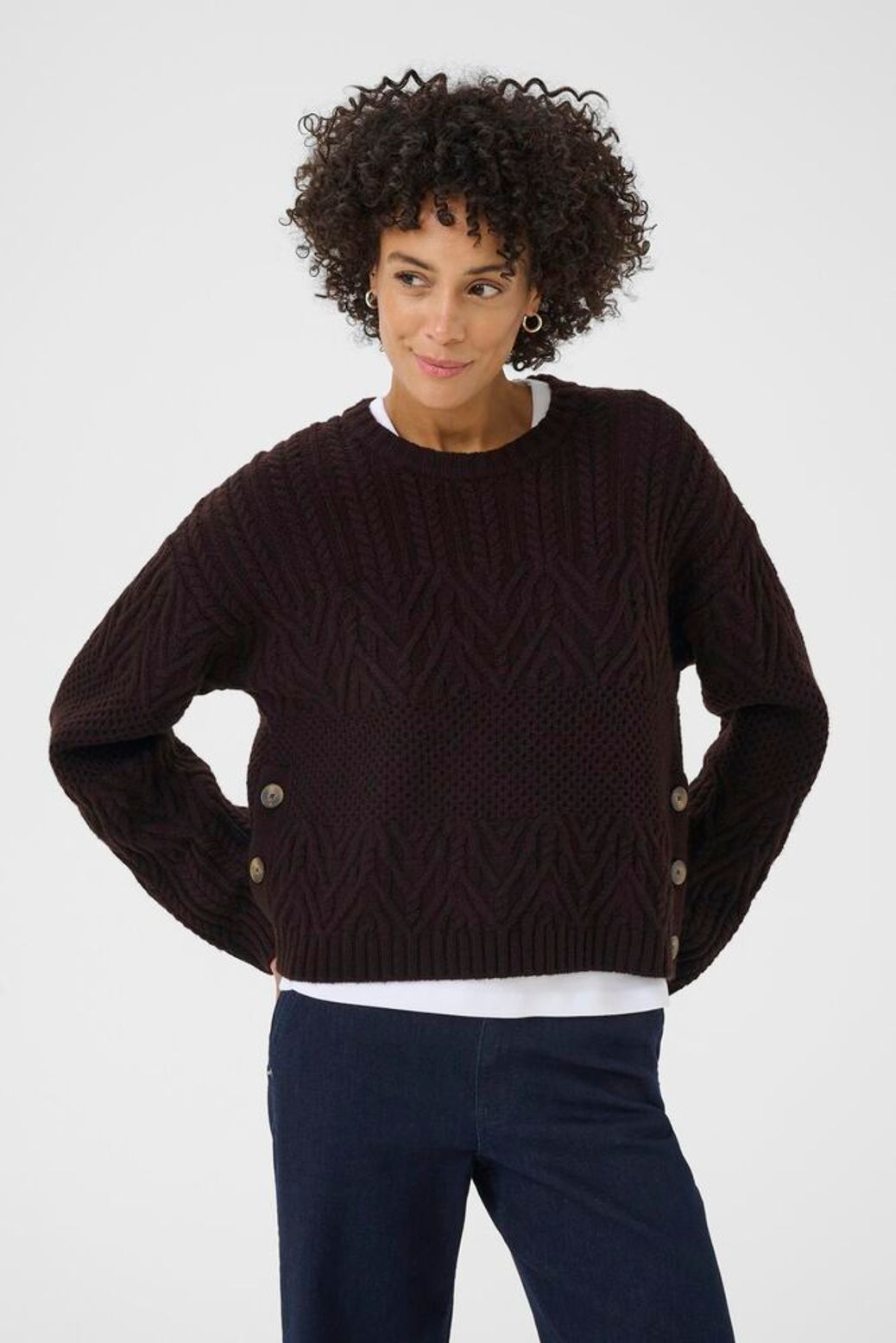 Elevate your wardrobe with the Sindy Ganache Brown Cable Sweater. Featuring a relaxed fit and long sleeves, this round-neck sweater offers both comfort and style. The unique side button detailing adds a subtle, elegant touch, making it perfect for casual days or layering during cooler weather. Its rich ganache brown hue blends effortlessly with any outfit, ensuring you stay