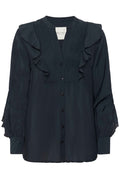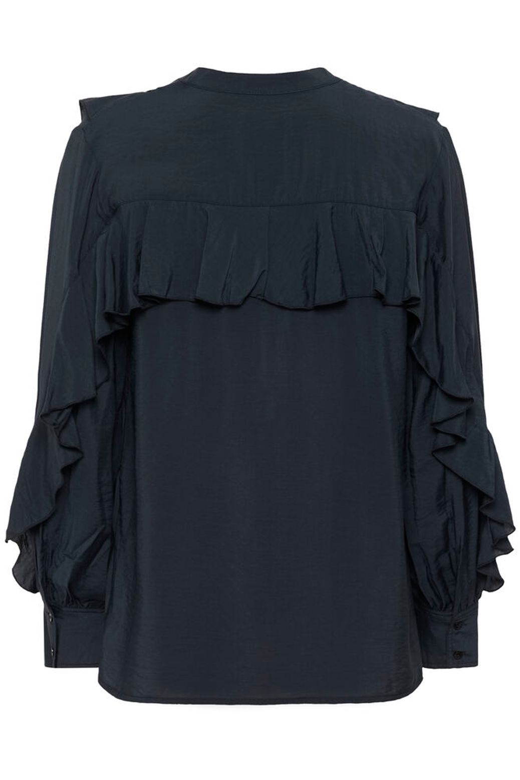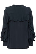 This dark blue blouse is made from a light, glossy fabric and features delicate pleats and ruffle details at the front and along the sleeves. The open neckline and wide cuffs add a feminine and refined touch. Style with both trousers and skirts.
